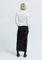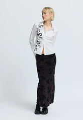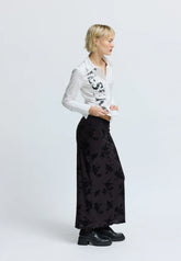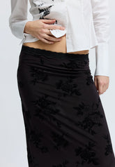 Jupe longue en jersey imprimé fleurs, galon dentelle à la taille.