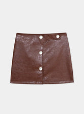 Jupe courte taille haute en faux cuir avec fermeture asymétrique sur le devant.