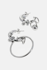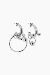 Boucles d’oreilles argentées dépareillées ornées de piercings droits et d’anneaux incrustés de cristaux.