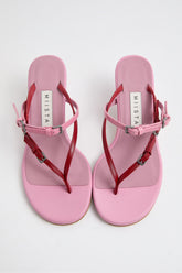Sandales à talon en cuir rose avec brides fines et boucles ajustables.