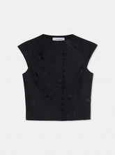 Top noir sans manches avec broderies ton sur ton.