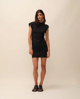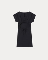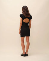 Robe courte noire près du corps avec dos ouvert.