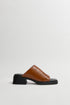 Mules Zooey en cuir brun avec bout ouvert et talon évasé.